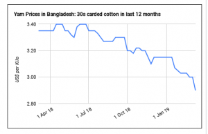 Cotton prices have also declined in the last month on the international market, meaning that material costs have dropped at yarn plants in Bangladesh.