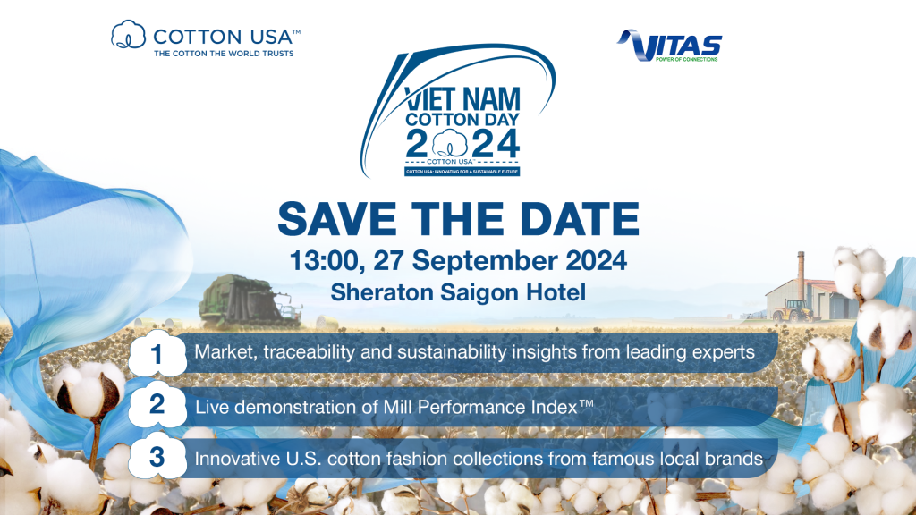 Join the Vietnam Cotton Day 2024 event, brought to you by Cotton USA and Vitas. Mark your calendars for this exciting event on September 27th, 2024 at the Sheraton Saigon Hotel.