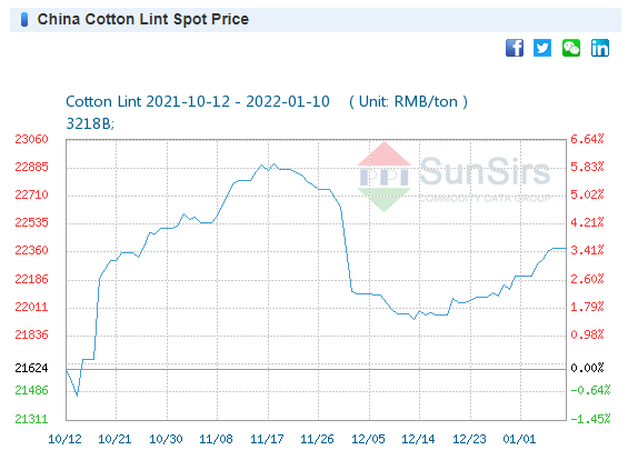 Giá: Ngày 5/1, giá sợi bông 32S ở mức 30.166 nhân dân tệ/tấn, bằng với giá cuối tuần trước.