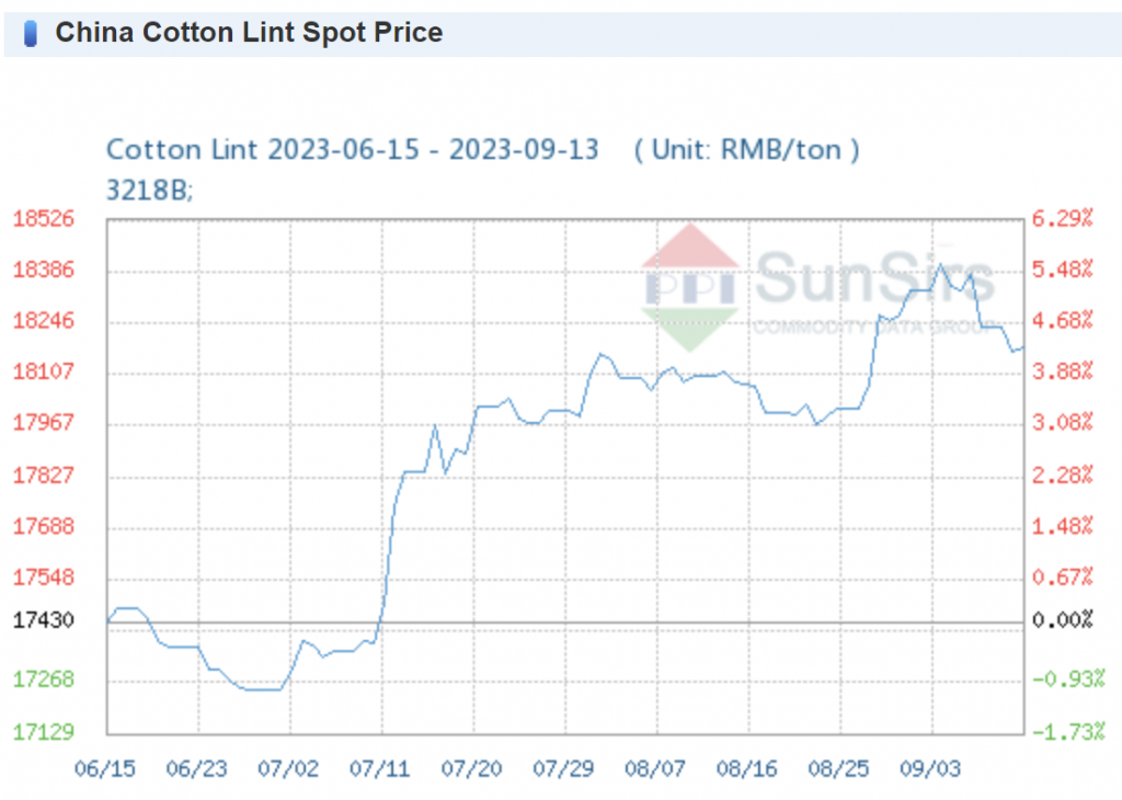 ?Cotton candy prices surged by 1.13% to settle at 61060, driven by concerns over supply from key U.S. growing regions. The U.S. Department of Agriculture (USDA) reported that 31% of the cotton crop was in good to excellent condition, with a slight decline following Hurricane Idalia’s passage. China’s cotton production for 2023/24 has been lowered to 5.9 million metric tons due to reduced planted areas, according to the USDA’s Foreign Agricultural Service. The USDA’s August WASDE report also adjusted cotton forecasts, reducing production by 2.7 million bales while increasing consumption by 500,000 bales.