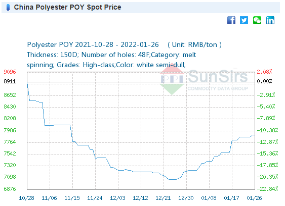 On January 21, the price of 3128B lint cotton was around 22,706 yuan/ton, up 237 yuan/ton from last weekend, up 3.01% month-on-month.