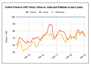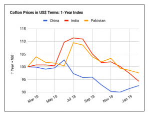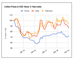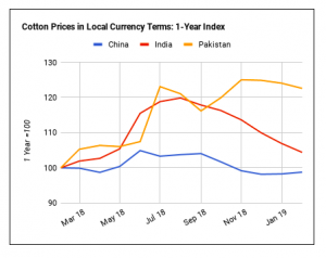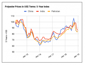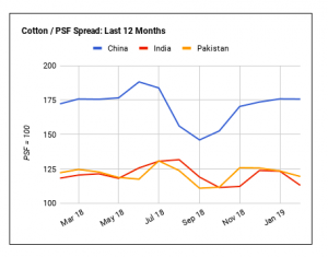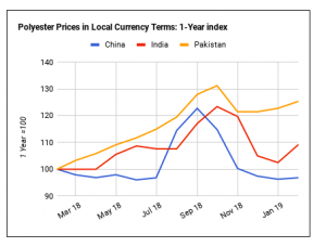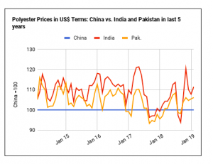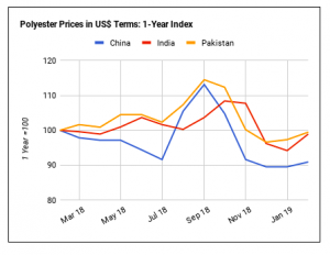 Với giá bông giảm ở Ấn Độ và Pakistan thì giá polyester tăng vào lúc này, chênh lệch giá bông so với polyester đã giảm ở cả hai nước trong tháng Hai. Do đó, việc sử dụng bông nên được ưu tiên đối với sự thiệt hại của polyester. Việc sử dụng bông bây giờ nên được hỗ trợ bởi giá bông suy yếu ở Ấn Độ và Pakistan trong khi ngược lại giá polyester đã tăng trong tháng trước.