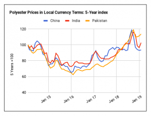 Từ cùng tháng năm trước, giá PSF đã tăng 9% ở Ấn Độ, tăng 25% ở Pakistan. Ngược lại tại Trung Quốc giá polyester đã giảm 3%.