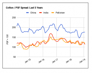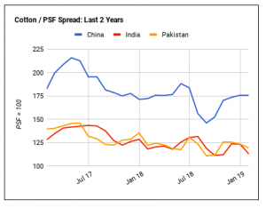 Vì thế, chênh lệch giá bông so với polyester vẫn không thay đổi ở Trung Quốc, việc sử dụng PSF số lượng lớn ở nước này chiếm ưu thế trái ngược với việc sử dụng bông chiếm ưu thế ở Ấn Độ và Pakistan.