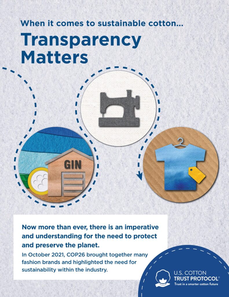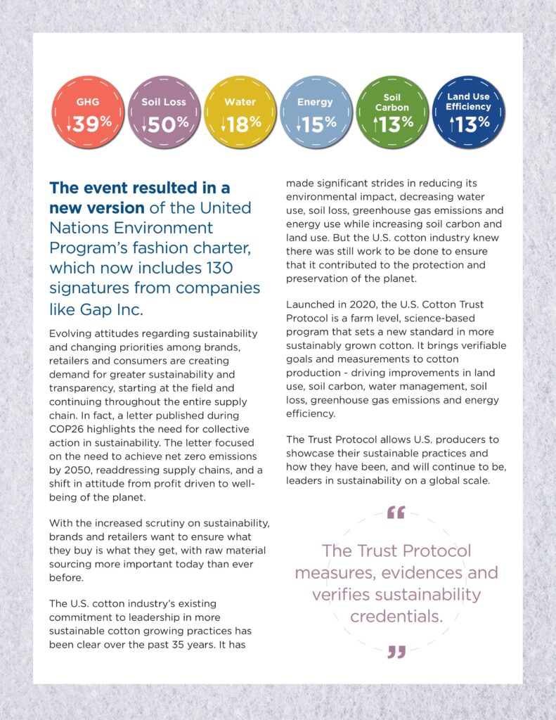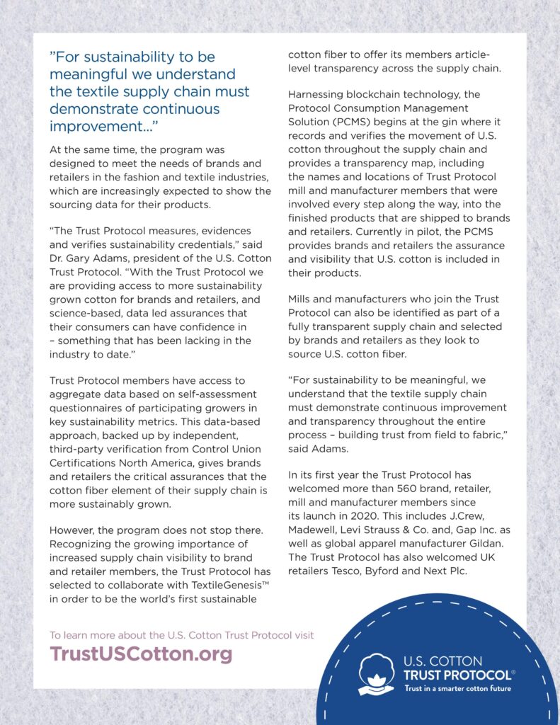 Chương trình U.S. Cotton Trust Protocol được thiết kế để xây dựng một tiêu chuẩn mới cho bông trồng bền vững, đảm bảo góp phần vào việc bảo vệ và bảo tồn hành tinh này, với các phương pháp bền vững và có trách nhiệm nhất.
