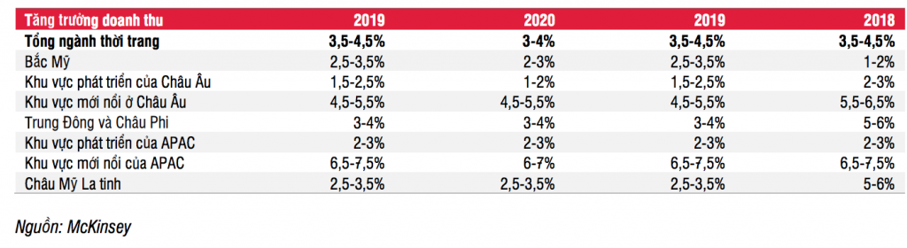 The McKinsey Global Fashion Index dự đoán doanh thu ngành thời trang thế giới sẽ tăng 3-4% YoY trong năm 2020, so với mức 3,5-4,5% YoY trong năm 2019. Mức dự báo thấp hơn phản ánh người tiêu dùng ngày càng thận trọng hơn trong bối cảnh bất ổn về nền kinh tế vĩ mô lớn hơn và những đe dọa từ chiến tranh thương mại tiếp tục diễn ra. Tại thị trường Mỹ và EU, tâm lý người tiêu dùng bất ổn trong khi ở thị trường mới nổi Châu Á-Thái Bình Dương tương đối mạnh nhưng tăng trưởng cũng giảm dần. Lợi ích kinh tế sẽ tiếp tục chảy vào một nhóm nhỏ các công ty hàng đầu được lựa chọn, trong khi các công ty tầm trung càng càng bị chèn ép.